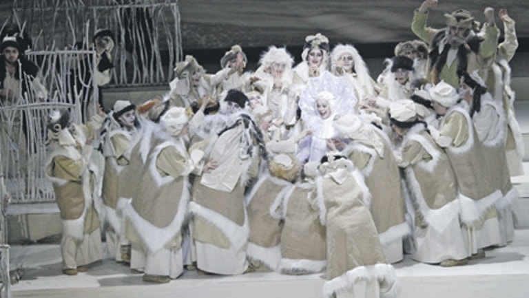 Панджавидзе следует пантеистическим идеям Римского-Корсакова и Островского, автора знаменитой пьесы. В его постановке природа пытается восстановить равновесие: Бог Ярило отправляет к берендеям наместника, своего сына Леля (Наталья Дикусарова), с жестокой целью – уничтожить Снегурочку и снять заклятие Мороза, обрекшего землю на вечный холод.