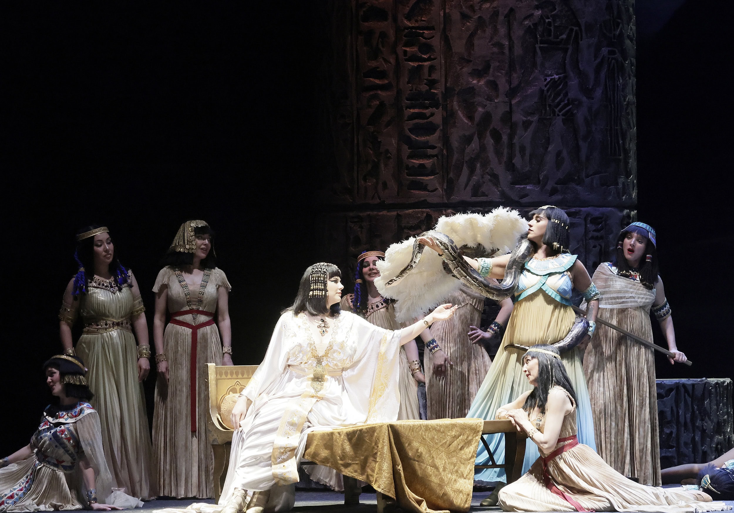 Был еще хороший хор за сценой и на сцене. И балет, дважды. В сцене заклинания бога в храме (соло танцовщицы-божества с крыльями и голыми длинными ногами) и во время триумфа (битва бритых египтян с бородатыми варварами-эфиопами). Оба фрагмента публику развлекли. На колени там никто, к счастью, надолго не становился. Хотя в танце это без вопросов.