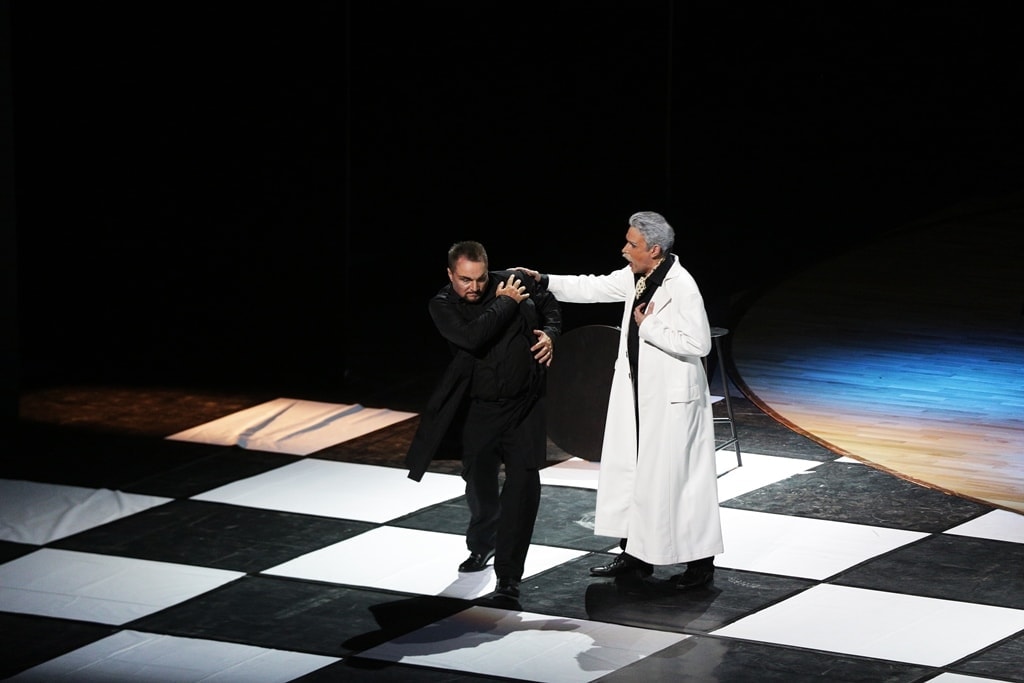 По замыслу режиссера персонажи — фигуры на шахматной доске, где едет сражение между двумя главными персонажами – Мазепы и Кочубея. Оба героя отражены в виде огромной статуи с двумя головами – льва и волка. Партию гетмана Мазепы исполняет Дмитрий Неласов, а его противника Кочубея – Сергей Плешивцев.