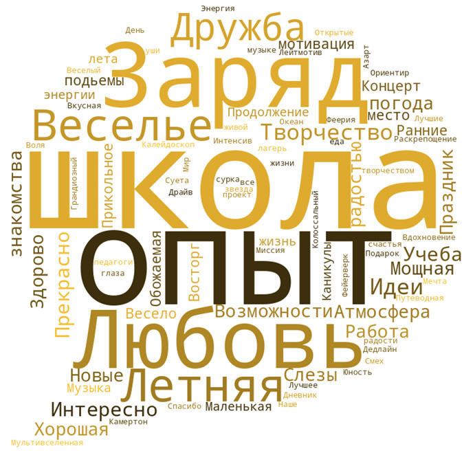 …Веселье, Дружба, Творчество, Дополнительный опыт, Реализация новых идей, Интересная учеба, Прекрасно, Замечательная атмосфера, Праздник, Хорошая погода, Здорово, Возможности, Работа с радостью, Новые знакомства, Слезы, Мощная мотивация, Прикольное место, Ранние подъемы, Концерт, Обожаемая школа, Восторг, Продолжение лета, Заряд энергии, Музыка 24/7, Каникулы, Маленькая жизнь, Мультивселенная, Интенсив радости, Любовь, Суета, День сурка, Вдохновение, Лучшее в жизни, Вкусная еда, Наше все, Энергия, Заряд творчеством, Колоссальный опыт, Открытые глаза и уши, Раскрепощение, Лагерь, Океан, Воля, Миссия, Азарт, Юность, Драйв, Камертон, Дедлайн, Дневник, Ориентир, Путеводная звезда, Калейдоскоп, Лейтмотив счастья, Смех, Лучшие педагоги, Мечта, Грандиозный проект, Феерия, Пожарка, Фейерверк, Мир…