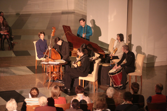 Пустынные огромные помещения, гулкая акустика, бренчит теорба, подхватывает барочная гитара, поддакивает виолон, гнутый цинк выводит мелодии XVI века своим чистым мальчишеским тембром, к нему присоединяется звонкий сакбут, предшественник тромбона, и вместе два духовых голоса уносятся под купол; маленькая виола, прабабушка скрипки, кружится вместе с держащим ее в руках исполнителем, певцы постукивают каблуками и кастаньетами, подтанцовывают ударные. Музыка непонятно когда возникает и непонятно когда заканчивается, она погружает слушателей в бесконечный, текучий и очень комфортный импровизационный поток, окружает их со всех сторон в прямом смысле — потому что музыканты большей частью не стоят на одном месте.