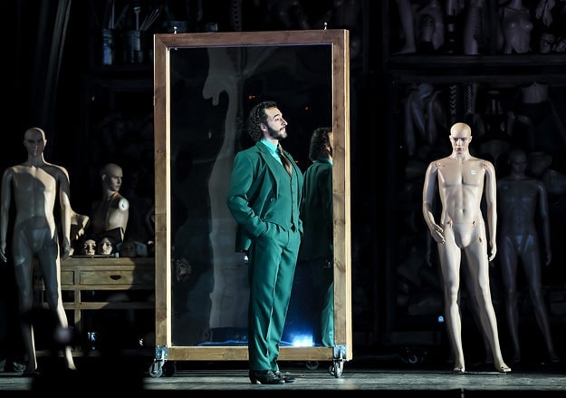 Во время увертюры на видео полыхают открытки и люди, в финале — ад, выплевывающий ногу и вечно зеленый пиджак свободолюбца. Лексика аргентинки, пятнадцать лет работавшей в каталонской группе La Fura dels Baus, через запятую выдает сюрреализм, гиньоль, артхаусное видео, парад нетрадиционалов с хором Viva la liberta, гэг с заложником-Лепорелло. Легкомыслием пресловутой dramma giocoso — веселой драмы, которую де сочинил Моцарт, обольщаться излишне.