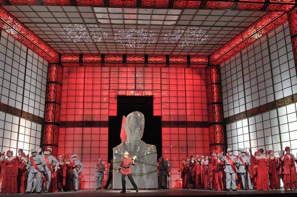 Сопротивление материала, то есть музыки, умозрительной режиссерской концепции начинаются с оркестровой прелюдии. На просцениуме бродят какие-то фигуры, они падают трупами, видимо, символизируя страдающий от тирании народ, и трупы эти утаскивают люди в форме. Таинственная беготня «темы заговорщиков» в оркестре еще как-то с этим сочетается, но она сменяется мелодией любви, и тут уж раскосяк между тем, что мы видим и слышим, полный. Не стану описывать дальнейшие несуразицы. Упомяну только сцену Рикардо и Амелии на кладбище, когда музыка пылает разрывающими душу чувствами, а художник спектакля Луиджи Скольо с подачи режиссера увесил стены (?!) портретами и фотоснимками… мертвых королей, президентов и прочих властителей разных времен. В первые минуты зритель ошеломленно разглядывает их и пытается понять, кто там есть кто (я даже Брежнева в гробу углядел!), а потом плюет на это бессмысленное занятие и отдается музыке.
