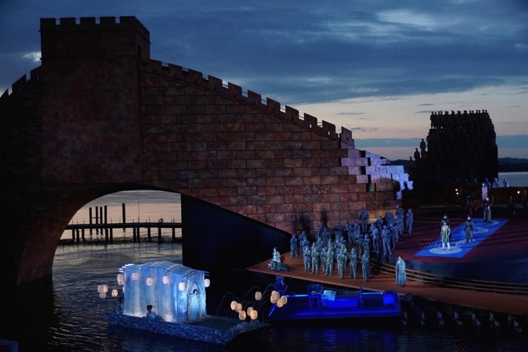 Марелли сам придумал декорации к последней опере Пуччини. Из их общей массы в 335 тонн основной вес приходится на Великую Китайскую стену (как раз ее звенья сделал в свое время единым целым император Цинь Шихуанди). Для ее строительства в Брегенце потребовалось 650 огромных кирпичей, всего на монтаж ушло 29 000 деталей. И все ради того, чтобы было где разгуляться фейерверкам, изрыгающим огонь драконам, акробатам, а также публичным казням и обязательно лодкам, иначе зачем озеро?