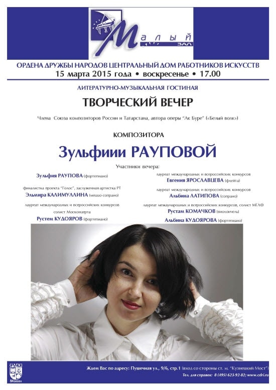 В Москве, в Центральном доме работников искусств, при аншлаге прошел творческий вечер композитора Зульфии Рауповой.
