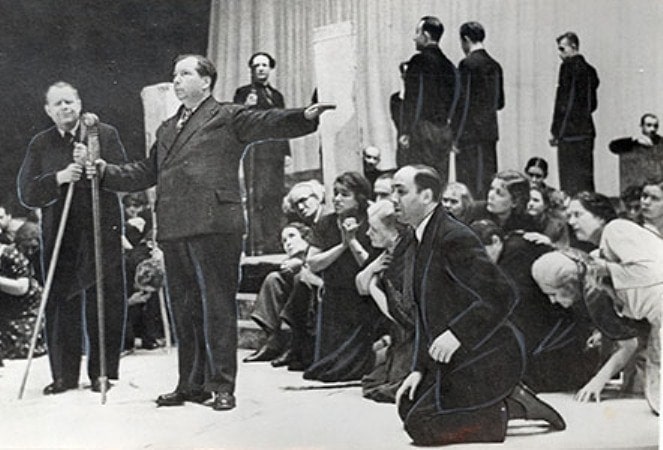 Оперная труппа Большого театра продолжила в Куйбышеве работу над оперой «Борис Годунов» Мусоргского в инструментовке Шостаковича. На публикуемом снимке — момент репетиции сцены «У храма Василия Блаженного» из «Бориса Годунова». В центре великий бас Максим Михайлов – Борис, справа от него на переднем плане тенор Соломон Хромченко – Юродивый. Этот и другие редкие архивные снимки из фонда музея Большого театра были предоставлены мне в середине 1980-х годов моими друзьями — тогдашним директором музея Валерием Зарубиным и научным сотрудником Людмилой Рыбаковой.