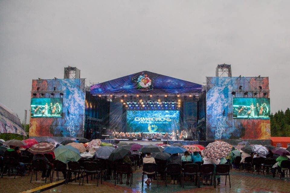 Прямо под дождём известный певец Аскар Абдразаков выступил на фестивале искусств «Сердце Евразии» в сопровождении Национального симфонического оркестра Республики Башкортостан.