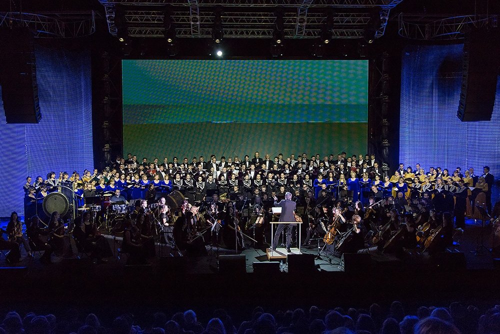 Пять хоров, молодежный симфонический оркестр и дирижер Жан Деруаэ выступили на фоне страшных кадров хроники.