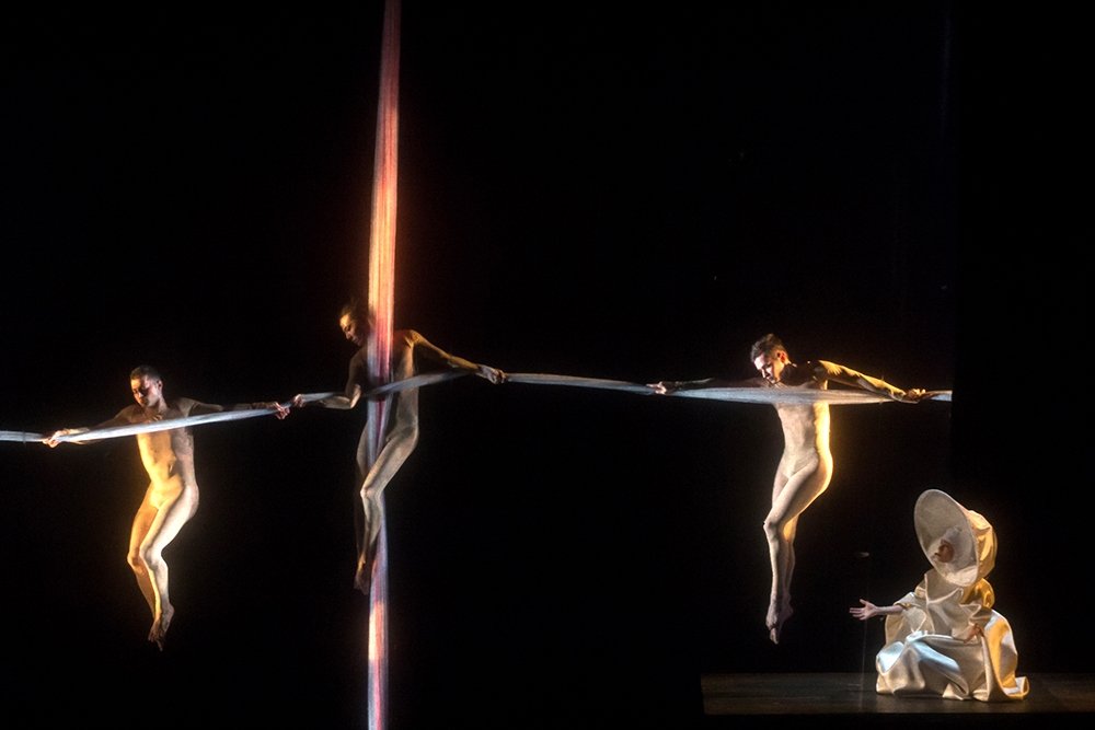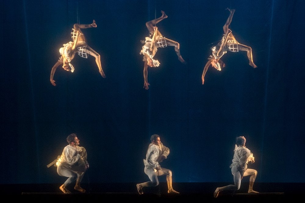 Итальянские артисты познакомили публику с «театром чуда»: певцы и музыканты подвешены высоко над сценой, танцовщики кувыркаются в воздухе, игнорируя законы притяжения.