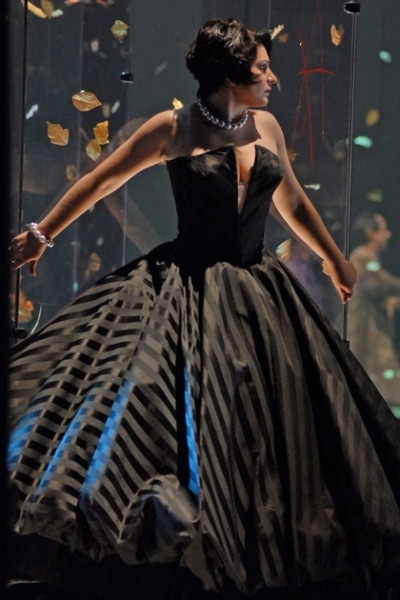 Инсценировка оторвана от эпохи “Дамы с камелиями”, декорации воссоздают витрины бутиков с лепестками и поддувом, в костюмах мешаются кринолины, свитера и новорусские пиджаки. Картины светских увеселений напичканы затхлым эротизмом, для “цыганской” сцены приглашен коллектив стриптизерш из ночного клуба. В этом Титель, увы, оказался первопроходцем. А вот трактовка — одиночество героини среди недалеких людей, пустота роскоши, ненужность подлинной любви — выдает усталость или отсутствие интереса к собственной работе.