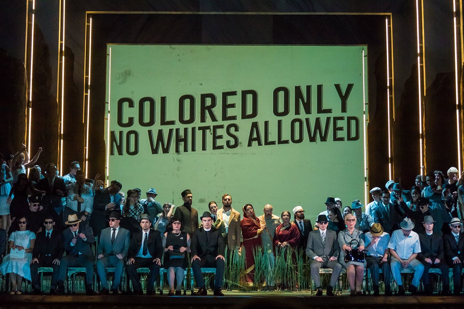 Третий акт – акт Мартина Лютера Кинга: мы видим на экране (и даже, недолгое время, слышим сквозь музыку) его речь, тогда как на сцене уже творится прямое насилие, доходящее до убийства. Чем могут отвечать на это великий мироучитель и его паства? Твердостью, неучастием, терпением, надеждой.